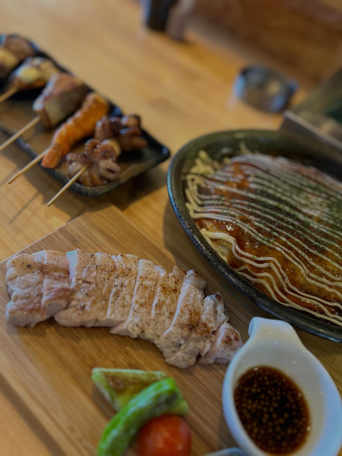 当店名物の魚串盛りを含む